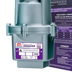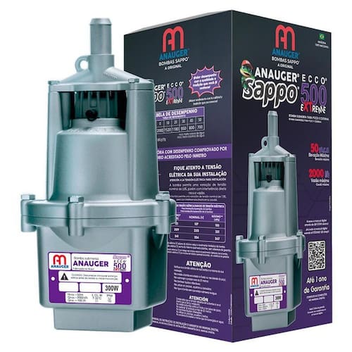 Bomba anauger sappo ecco 500 extreme 127v Bomba submersa vibratória para poço com diâmetro superior a 7 polegadas 180 mm . Possui potência de 300 watts e elevação máxima de 50 metros. É projetada para atender às necessidades básicas de água em residências, indústrias, pequenas irrigações e criações de animais. - características: Vazão máxima: 2.000 litros/hora Temperatura máxima da água: 35ºc Dimensões: altura 290mm e diâmetro 155mm Tensões: 220v - 254v Certificação: abnt nbr iso 9001 Altura manométrica máxima: 50m elevação Bombeamento de água sem resíduos sólidos Frequência: 60 hz Isolação elétrica: classe h Grau de proteção: ip68 Proteção contra choque elétrico: classe ii Potência nominal: 300w - itens inclusos: 1 bomba anauger sappo ecco 500 extremem 127v - : 12 meses fabricante Marca: anauger Modelo: sappo ecco 500 extreme Código de barra: 7892201604834 Imagens meramente ilustrativas, podendo sofrer pequenas alterações. Todas as informações divulgadas são de responsabilidade do fabricante/fornecedor Marca: Não Informado Ean: 7892201604834