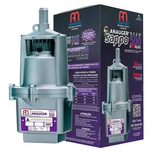Bomba anauger sappo ecco 500 extreme 127v Bomba submersa vibratória para poço com diâmetro superior a 7 polegadas 180 mm . Possui potência de 300 watts e elevação máxima de 50 metros. É projetada para atender às necessidades básicas de água em residências, indústrias, pequenas irrigações e criações de animais. - características: Vazão máxima: 2.000 litros/hora Temperatura máxima da água: 35ºc Dimensões: altura 290mm e diâmetro 155mm Tensões: 220v - 254v Certificação: abnt nbr iso 9001 Altura manométrica máxima: 50m elevação Bombeamento de água sem resíduos sólidos Frequência: 60 hz Isolação elétrica: classe h Grau de proteção: ip68 Proteção contra choque elétrico: classe ii Potência nominal: 300w - itens inclusos: 1 bomba anauger sappo ecco 500 extremem 127v - : 12 meses fabricante Marca: anauger Modelo: sappo ecco 500 extreme Código de barra: 7892201604834 Imagens meramente ilustrativas, podendo sofrer pequenas alterações. Todas as informações divulgadas são de responsabilidade do fabricante/fornecedor Marca: Não Informado