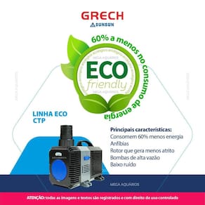 As bombas da linha Grech Eco CTP de alta vazão para aquários e lagos são anfíbias, ou seja, podem ser utilizadas dentro ou fora da água e possuem tecnologia exclusiva que chega a consumir cerca de 60% a menos de energia elétrica.