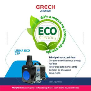 As bombas da linha Grech Eco CTP de alta vazão para aquários e lagos são anfíbias, ou seja, podem ser utilizadas dentro ou fora da água e possuem tecnologia exclusiva que chega a consumir cerca de 60% a menos de energia elétrica.