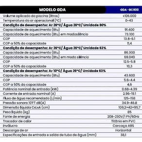 Uma bomba de calor para piscinas aquece até 106.000 Litros água utilizada energia térmica do ar, economizando energia em comparação a métodos tradicionais. Mantém a temperatura confortável durante o ano todo, é ecológica, resistente e adaptável com vários tipos de piscinas. Uma solução eficiente e econômica para aquecimento. Possui modo inteligente com tecnologia Full-Inverver que ajusta de forma inteligente a capacidade de aquecimento entre 20% e 100%, com base nas diferentes necessidades de aquecimento, com uma precisão incrível de 1%, economizando custos de energia enquanto mantem a piscina aquecida.
