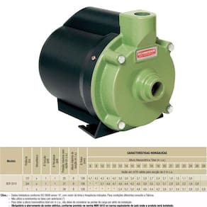 Bomba de água centrífuga 1,0 CV Mono BCR-2010 SCHNEIDER A bomba da Schneider é fabricada com a mais recente tecnologia do mercado e atenderá às suas expectativas de desempenho, durabilidade e produtividade. Esta ferramenta permitirá bombear grandes quantidades de fluxo de líquidos com excelente desempenho e baixo custo de consumo. Múltiplos usos e capacidade de bombeamento: Esta ferramenta é a melhor alternativa para transportar água para tanques elevados ou para transportar líquidos de um tanque para outro. As bombas centrífugas aumentam a velocidade dos fluidos para que possam percorrer longas distâncias. Suas principais vantagens são a fácil adaptação a diferentes circunstâncias e a sua longa vida útil. Maior potência: Esta bomba irá ajudá-lo a empurrar a água através dos dutos ou tubos usando uma força centrífuga de 1 cv de potência, convertidos em energia mecânica. Esta energia aumenta a pressão do fluido, sua velocidade e sua altura, conseguindo distribuir a água em todo lugar. Aplicações Gerais: Residências Fontes e cascatas Chácaras DADOS TÉCNICOS: Caracol da motobomba de ferro fundido GG-15 Rotor fechado de Noryl, com 30% de fibra de vidro (maior resistência) e inserto metálico Selo mecânico constituído de aço inox AISI-304, buna N, grafite e cerâmica Motor elétrico IP-00 com capa de proteção, proteção térmica e capacitor permanente, 2 Polos, 60 Hz Voltagem única: 127V ou 220V Tipo de bomba centrífuga: Centrífuga Material do rotor: Noryl Altura máxima de sucção: 8 m Temperatura máxima de entrada de água: 55 C Diâmetro de entrada: 1 POL Diâmetro de saída: 1 POL Importante Temperatura máxima do líquido bombeado: 55C. Equipamento desenvolvido para uso exclusivamente residencial.