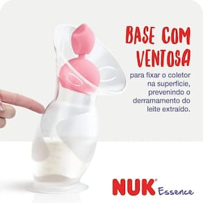 Principais características - a bomba manual coletora de leite nuk essence foi especialmente projetada em silicone 100% macio e flexível garantindo maior conforto durante o uso, sendo ideal para facilitar a rotina de amamentação - seu design é prático, de fácil adaptação e aderência à mama, e pode ser utilizado sem a necessidade do uso das mãos, após formar um vácuo durante a ejeção natural do leite - além disso, o coletor pode ser utilizado em diferentes momentos: em conjunto com a amamentação, extração com bomba manual ou elétrica, ou em um único seio para coletar o leite de forma natural através de uma sucção suave e indolor - com capacidade para coletar 90ml, sua régua graduada ajuda a controlar o fluxo de leite extraído. O coletor possui base com ventosa para fixar em superfícies planas, evitando o derramamento do leite extraído e stopper antivazamento que protege o leite e evita contaminações - livre de bpa