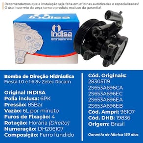 Bomba de Direção Hidráulica Ford Fiesta e Ecosport 1.6 8v Zetec Rocam - Indisa