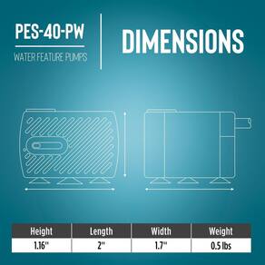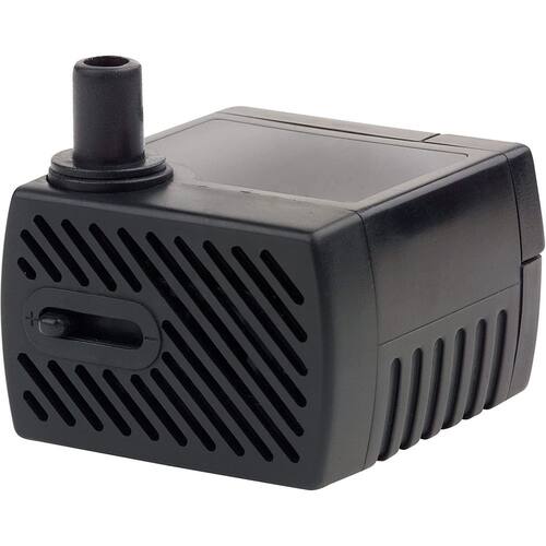 - ESPECIFICAÇÕES: 120 volts; 0,03 amperes; 2,5 watts; cabo de 6 pés; adaptadores farpados de 3/8 polegadas e 1/2 polegadas incluídos; 45 GPH com elevação de 1 pé; fechamento de 2,1 pés; altura máxima da fonte 16,8 polegadas ou menos