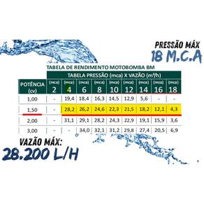A Bomba para Piscina BM foi desenvolvida pensando em uma maneira prática e simples de ser instalada, o que torna o processo de instalação muito mais fácil. O modelo é recomendado para piscinas que tenham até 176 mil litros de água, nas quais ele consegue desempenhar o seu máximo. A Bomba para Piscina BM-150 conta com as tecnologias mais avançadas da Sodramar para proporcionar momentos de lazer muito mais agradáveis para sua família em sua piscina. O modelo é extremamente eficiente, purificando a água com muita facilidade e praticidade. Outra característica marcante da Bomba é o fato de ela ser extremamente resistente e ter uma vida útil muito longa, devido aos seus componentes de alta qualidade. Produto acompanhado de 02 uniões de 1.1/2.