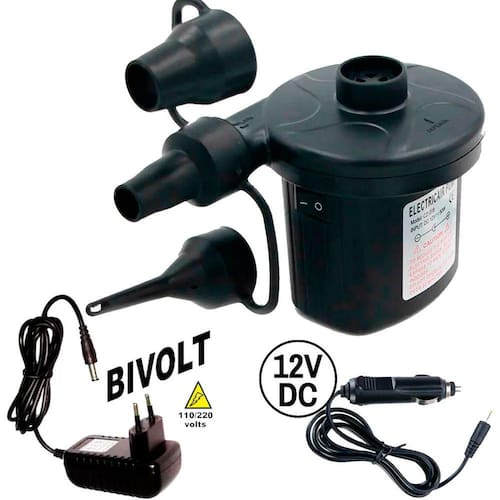 Itens inclusos: - Inflador elétrico; - Fonte bivolt (110V/220V) cabo com 1 metro de comprimento - Tomada veicular para acendedor de cigarr o (12 V) cabo com 1,20 metro de comprimento; - 3 bicos cônicos de tamanhos diferentes (menor varia de 8 a 18 mm de diâmetro, o do meio varia de 17 a 22 mm de diâmetro e o maior varia de 22 a 27 mm de diâmetro).