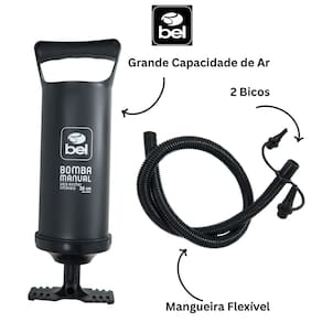 Apresentamos a Bomba Manual Bel, a solução prática, eficiente e indispensável para inflar seus acessórios com total facilidade. Projetada para oferecer o máximo de desempenho, ela é ideal para quem busca um inflador manual portátil, leve e resistente, perfeito para: Colchões Infláveis Botes Piscinas Boias Brinquedos Infláveis e muito mais. Compacta e extremamente funcional, a Bomba Manual Bel garante enchimento rápido graças ao seu sistema de bombeamento eficiente e à mangueira flexível que facilita o uso em diferentes ângulos. Acompanha três adaptadores de válvula que ampliam sua compatibilidade com diversos modelos de infláveis, permitindo inflar desde itens menores até produtos maiores de forma simples e prática. Fabricada em PVC e PP de alta qualidade, é um produto durável, seguro e resistente ao uso contínuo, ideal para levar em viagens, acampamentos, praias ou manter em casa como um acessório sempre pronto para uso. Seu design leve e portátil facilita o transporte e armazenamento, tornando-a uma escolha inteligente para quem busca agilidade no dia a dia. Com a Bomba Manual Bel, você não depende de energia elétrica ou baterias. Basta usar a força das mãos para inflar seus produtos rapidamente, garantindo autonomia, economia e praticidade, especialmente em ambientes externos ou situações emergenciais. Garanta já a sua Bomba Manual Bel e tenha sempre por perto um inflador manual confiável, eficiente e compatível com os principais infláveis do mercado. Especificações Técnicas Acompanha 01 bomba, 01 mangueira com 02 bicos Estrutura PP (Polipropileno) e PVC Tipo Bomba manual portátil Observação Indicada para inflar botes, colchões infláveis, piscinas, boias e outros infláveis Cor Preto