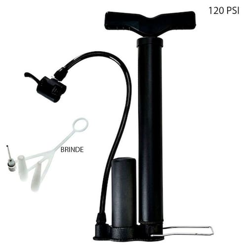 bomba de ar de alta pressão, sem manômetro, de mão com apoio no pé em material de alumínio resistente para encher pneus de bicicletas mtb e speed, motos, carro, boias, piscina infantil, bolas, colchão de ar e etc. Suporta até 120 psi/bar material em alumínio resistente mangueira em material emborrachado maleável e resistente embolo leve ergonomico e ajustavel as mãos possui acessórios ponta para encher bola e ponta para encher piscina infantil, colchão inflável etc altura até 55 cm. Bomba sem manômetro e na cor preta