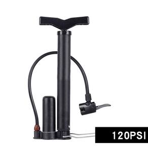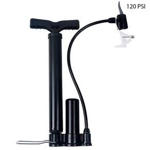 bomba de ar de alta pressão, sem manômetro, de mão com apoio no pé em material de alumínio resistente para encher pneus de bicicletas mtb e speed, motos, carro, boias, piscina infantil, bolas, colchão de ar e etc. Suporta até 120 psi/bar material em alumínio resistente mangueira em material emborrachado maleável e resistente embolo leve ergonomico e ajustavel as mãos possui acessórios ponta para encher bola e ponta para encher piscina infantil, colchão inflável etc altura até 55 cm. Bomba sem manômetro e na cor preta