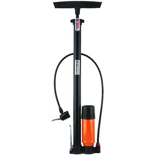 Bomba manual com mangueira e bico para pneus de bicicleta com reservatório e manômetro. Corpo em aço, reservatório e bico em aço laminado, base em ferro fundido, mangueira e alça em polipropileno. Medidas: 590 mm de altura e 32 mm de diâmetro.