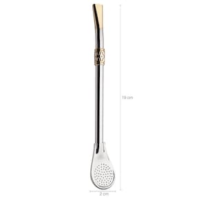 Desfrute seu chimarrão com qualidade, sabor e tradição! #Peça Inteira #Bojo Pêra #19cm Garantia: 90 dias / Peso: 030g/ Cor: Prata e Dourado/ Ref: 111 Dimensões: 2cm(C) x 1cm(L) x 19cm(A) Cuidados: Não lavar com materiais abrasivos. Após o uso lavar com esponja macia e sabão neutro, guardar o produto seco. Bomba: Sem Rosca. Material: - Ferro: Material de alta durabilidade, com excelente camada de protetivo, não perde suas propriedades. Bomba de qualidade medindo 19cm de altura, fabricada em ferro, possui bocal dourado, dando aquela nobreza na bomba. Cano com anel trabalhado em dourado vai compor perfeitamente com sua cuia. Bojo em formato de pera é indicada para mate, mas pode ser usada para Tereré e Chimarrão.