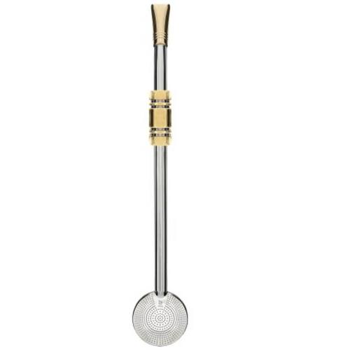 Bomba de Chimarrão Mil Furos 25cm Inox Anel Sextavado Com Rosca Bojo Banho de Ouro Escovinha.