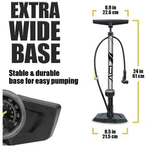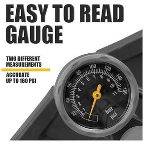 Design de válvula dupla A cabeça da válvula recém projetada pode alternar facilmente entre as válvulas Presta e Schrader e sem vazamentos de ar. Não há mais reverso Velocidade de Inflação Pressão Máxima 160 psi. A mangueira extra longa com pivô de 360 graus facilitará seu bombeamento. Medidor Exato e Extra Grande O medidor grande é fácil de ler e o ajudará a definir a pressão desejada. Estável e durável barril de aço com alça confortável ergonomicamente projetada Marca: Não Informado