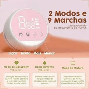 A bomba de leite oferece um design integrado com uma tela LED que exibe o modo atual, tempo, nível de sucção e capacidade da bateria, garantindo uso intuitivo.