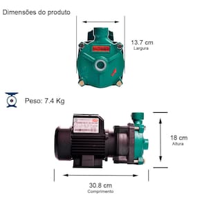 Motobomba Centrífuga Monoestágio - Monobloco - Motor Monofásico em II Polos, 60Hz, 3500rpm - Bocais com rosca BSP, Sucção 3/4" x Recalque 3/4". Utilizada para água limpa até temperatura de 40ºC. Carcaça da bomba em ferro fundido GG-20. Rotor fechado em termoplástico. Anel O'ring de vedação da carcaça em Buna N. Selo mecânico: Faces em grafite e cerâmica. Mola em inox 304 e elastômero (borracha) em Buna N.
