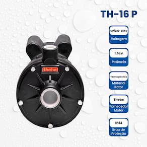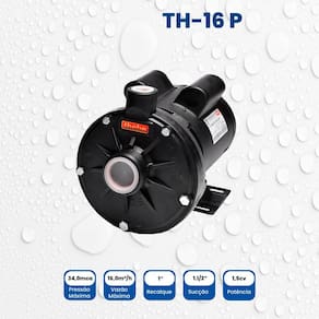 Indústrias/Processos: Circulação, Filtragens, Máquinas Operatrizes, Utilidades, Fornos de Indução, Cabine de pintura. Acompanha bóia elétrica: Não Acompanha válvula de retenção: Não Altura: 20 cm Altura manométrica total: 34 mca Ambiente Principal: Jardim e Varanda Composição: Carcaça, rotor e tampa traseira em termoplástico. Anel O'ring de vedação da carcaça em Buna N. Selo mecânico: Faces em grafite e cerâmica. Mola em inox 304 e elastômero (borracha) em Buna N. Comprimento: 28 cm Conexão de entrada/saída: Sucção 1.1/2" x Recalque 1" Ergonômico: Não Funcionamento: Elétrica Itens Inclusos: 1 Bomba TH-16 P 1,5 cv Largura: 20 cm Manual de Montagem e Instalação: https://product-hub-prd.madeiramadeira.com.br/971755/documents/8f92ef82-2b2c-4e1e-bc36-dd9d209492a12584606578317340306758475.pdf Marca: EBARA Material Principal: Termoplástico Modelo: Bomba TH-16 P 1,5 cv Necessita Montagem: Não Origem do Produto: Nacional Peso: 5,3 kg Potência do motor: 1,5 HP Potência do Motor (W): 1,5 W Profundidade de sucção: 3 m Recomendações de Uso, Manutenção e Limpeza: Verifique nosso manual de Manutenção Rotação do motor: 3.500 rpm Temperatura Máxima da Água: 40 °C Tipo de Água: Água Limpa Tipo de bomba de água: Centrífuga Vazão máxima: 16 L/h Voltagem: Bivolt