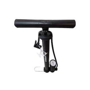 Bico: reversível presta e schrader. Barril: aço Estrutura externa: nylon Manômetro: manometro analógico Estrutura para apoio dos pés com mini reservatório Pressão de calibragem: 100 psi Tubo em 3 polegadas com 59 cm de altura.