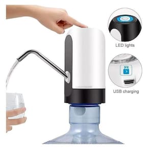 Bomba elétrica recarregável para galão de água, compatível com galões de 5l, 10l, 20l e similares. Possui bateria de longa duração, vazão de 1 litro em 35 segundos, e é feita de materiais seguros como aço inox 304 e silicone.Água gelada