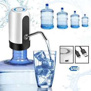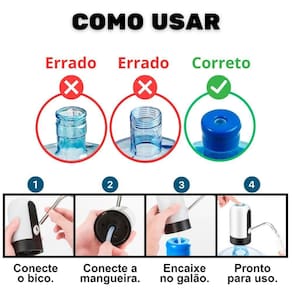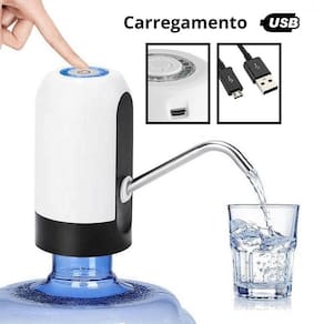 Prático e simples de beber água, podendo ser levado para qualquer lugar e ser utilizado em qualquer galão. Recarregável através de fontes de celular, bivolt.