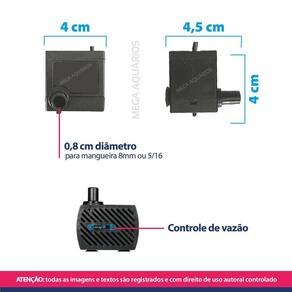 Especificações técnicas: Marca: Aquam Modelo: A-180 / BS-005 Potência: 3W Hmax: 55cm altura máxima que a bomba consegue elevar a água. Quanto mais alta a água precisa chegar, menos vazão chega no final Vazão: 180L/h Voltagem: Escolha a voltagem 110v ou 220v no botão do anúncio Indicado para aquários de até 30L Medidas: 4 x 4 x 4,5cm larg x alt x profundidade Peso: 114g Tamanho do fio: 140cm.