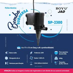 Bomba bombinha submersa jad boyu sp-2300 23w 1200l/h para aquário, cascatas pequenas e fontes de água Bombinha submersa blindada de baixo consumo de energia, design compacto, auxilia na oxigenação e na circulação da água. Preparada para ficar ligada constantemente. Ela é totalmente vedada, o que a torna segura para danos elétricos em contato com a água. Características: Um único equipamento com duas funções - bomba para circulação de água e oxigenador Bombinha submersa silenciosa e compacta Baixo consumo de energia Possui ventosas para fixação Acompanha mangueira de ar para auxílio na oxigenação Fácil instalação, limpeza e manutenção Resistente Durável Impeller de fácil Serve como peça de reposição para o filtro jad ou sp-2300ii sp-2300iii É possível encaixar até 3 refis de filtro esponja biológico modelo próprio Especificações técnicas: Marca: jad boyu a marca será enviada conforme disponibilidade Modelo: sp-2300 Potência: 23w Voltagem: escolha a voltagem no botão do anúncio Hmax: 1.6m altura máxima que a bomba consegue elevar a água Vazão: 1200l/h Indicado para aquários de até 240l Medidas: 6 x 17 x 13cm larg x alt x profundidade Peso: 686g Tamanho do fio: 140cm Marca jad / boyu As marcas jad e boyu pertencem ao mesmo fabricante, os produtos são exatamente iguais e chegam ao país por empresas diferentes, cada uma com um direito de uso de marca. Aplicação: Circulação de água em pequenos aquários Circulação de água em laguinhos Auxílio na oxigenação de água de pequenos lagos e aquários Elevar água do sump para aquário Direcionar água para sump Direcionar água para filtro tipo cânister Direcionar água para filtro uv ultravioleta Fontes de água com até 1m de altura Bebedouro grande para gatos Hidroponia Nota: 1 - nunca deixe a bomba ligada sem água em circulação, isso queimará a bomba em poucos minutos. 2 - a vazão da bomba indicada é referente a saída linear. Sempre que elevar para cima a água de uma bomba, sua vazão é reduzida levando em consideração os fatores: altura, diâmetro e curva da mangueira. Serve para fazer bolhas no aquário Não serve, o objetivo da bomba é de circulação de água. Para bolhas de ar é necessário um compressor de ar para aquário. Até quanto ela consegue elevar a água Cerca de 160 centímetros Obrigado pela visita e boas compras Atenção: nossas imagens e textos são registrados e com direitos de uso reservados a essa loja e as lojas parceiras devidamente autorizadas em contrato. Marca: Não Informado Ean: 7793299430476