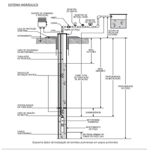 - Potência do motor: 1500W/ 2CV - Voltagem: 220V - Altura Manométrica: 101 mca - Vazão máxima: 5 L/h - Recalque de sucção: 1" - Cabo elétrico: 2 M - Cabo Plugue : 1 ponto - Profundidade de Instalação: 3 Metros