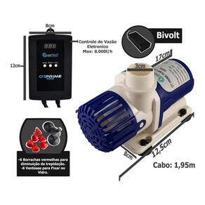Especificações técnicas da Bomba OtPrime 8000L/h: Vazão máxima: 8000 L/h Altura máxima:53m Consumo máximo: 85W Voltagem: bivolt (110V ou 200V) Tamanho: (LxAxP) 9,3x17,7x20,6cm Peso da bomba: 1.268g Peso total: 2.450Kg Saída de água: 25 ou 32mm Tamanho do fio até o controle: 150 cm Tamanho do fio do controle até a tomada: 300cm