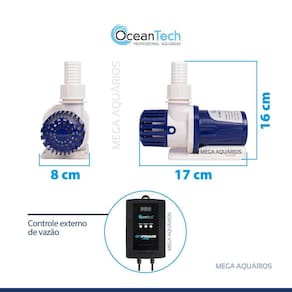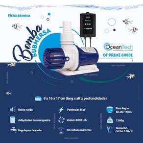 Bomba submersa OceanTech OT Prime Sine Wave com fluxo constante para aquário de água doce ou criação de ondas para aquário marinho - 8000 L/h - 85W A bomba OT Prime da Ocean Tech é o que tem de mais moderno no mercado e com a nova tecnologia Sine Wave, ela proporciona um maior controle de fluxo e vazão, adequando de acordo com a necessidade de cada aquário, seja de água doce ou salgada. Além do modo fluxo constante de água, ela tem dois modos de criação de ondas. Tudo isso com 3 anos de . LANÇAMENTO OCEANTECH 2021 Características: Nova tecnologia Sine Wave OceanTech Controle de vazão externo com 20 níveis de potência Possui 4 modos de fluxos A potência de saída pode ser ajustada para atender diferentes tamanhos de aquários A bomba pode ser utilizada para circulação e recalque de água e produção de ondas Com inversor DC trifásico inteligente de seis polos Baixa tenção de operação DC 24v Pode ser ligada nas tensões 110V e 220V Com eixo de cerâmica e mancal do eixo de fibra de carbono o que garante maior durabilidade Pode ser utilizada em água doce e salgada Manual em português Compacta Econômica Silenciosa Segura Especificações técnicas: Vazão máxima: 8000 L/h Altura máxima: 5m Consumo mínimo: 10W Consumo máximo: 85W Voltagem: bivolt 110V ou 200V Tamanho: 8x16x17 cm larg x alt x profund Peso só da bomba: 1.268g Peso total: 2.450kg Saída de água: 25 ou 32mm Tamanho do fio até o controle: 150 cm Tamanho do fio do controle até a tomada: 300cm Fluxos de água: 1 Modo de fluxo constante de água com 20 níveis vazão 2 Modo de criação de ondas de pulso com 20 níveis vazão começa com fluxo de água mais baixo para mais alto 3 Modo de onda de transmissão começa com fluxo de água mais baixo aumentando lentamente para o fluxo máximo e desacelerando até o fluxo mais baixo 4 Modo alimentação Feed a bomba para por 10, 20 ou 30 minutos Todos os modos são ajustáveis e selecionados pelo controle externo : 3 meses de para defeito de fabricação direto com a loja 3 anos de para defeito de fabricação direto com o fabricante A não cobre uso incorreto do equipamento Manutenção Limpe a bomba e todas as suas partes regularmente para garantir sua eficiência Mantenha o controlador seco e longe de respingos Nunca ligue o equipamento sem água, isso queimará a bomba em poucos segundos Conteúdo da embalagem: 1 Bomba OT Prime OceanTech 1 Controle externo de fluxo e vazão 1 Cabo de energia 1 Fonte de energia 1 Manual de instruções 2 Adaptadores de mangueira 1 Adesivo dupla face 1 Fita tecido autocolante para fixar controle externo 6 Borrachas vermelhas para diminuir trepidação 6 Ventosas para fixação da bomba em vidro Fotos, templetes e textos registrados. Todos os direitos reservados a esse vendedor e a seus parceiros autorizados. Ean: 7793300501423