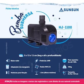 Especificações técnicas: Marca: Sunsun Modelo: HJ-1100 Potência: 200W Hmax: 1.5m altura máxima que a bomba consegue elevar a água Vazão: 900 L/h Voltagem: escolha a voltagem no botão do anúncio Indicado para aquários e lagos de até 180L Medidas: 5 x 13 x 12cm larg x alt x profundidade Peso: 496g Tamanho do fio: 140cm