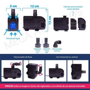 Aplicação: Circulação de água em aquários Circulação de água em lagos / laguinhos Elevar água do sump para aquário Direcionar água para sump Direcionar água para filtro tipo cânister ou filtro UV ultravioleta Fontes de água / chafariz / cascata com até 1m de altura Hidroponia