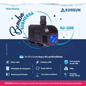 Especificações técnicas: Marca: Sunsun Modelo: HJ-1100 Potência: 200W Hmax: 1.5m altura máxima que a bomba consegue elevar a água Vazão: 900 L/h Voltagem: escolha a voltagem no botão do anúncio Indicado para aquários e lagos de até 180L Medidas: 5 x 13 x 12cm larg x alt x profundidade Peso: 496g Tamanho do fio: 140cm