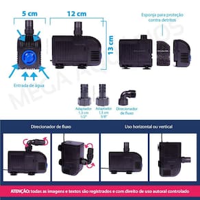 Aplicação: Circulação de água em aquários Circulação de água em lagos / laguinhos Elevar água do sump para aquário Direcionar água para sump Direcionar água para filtro tipo cânister ou filtro UV ultravioleta Fontes de água / chafariz / cascata com até 1m de altura Hidroponia