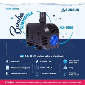Especificações técnicas: Marca: Sunsun Modelo: HJ-1500 Potência: 25W Hmax: 1.8m altura máxima que a bomba consegue elevar a água Vazão: 1500 L/h Indicado para aquários de até 300L Medidas: 5,5 x 12 x 13cm larg x alt x profundidade Peso: 614g Tamanho do fio: 145cm Saídas de 1/2 e 3/4