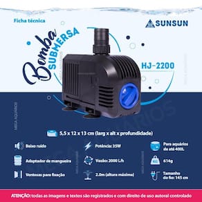 Especificações técnicas: Marca: Sunsun Modelo: HJ-2200 Potência: 35W Voltagem: 110v Hmax: 2.0m altura máxima que a bomba consegue elevar a água Vazão: 2000 L/h Indicado para aquários de até 400L Medidas: 5,5 x 12 x 13cm larg x alt x profundidade Peso: 614g Tamanho do fio: 145cm