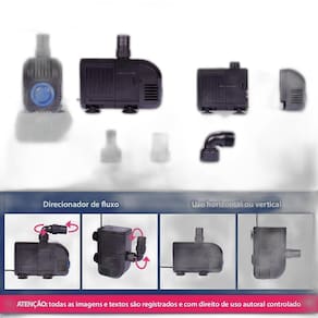 Aplicação: Circulação de água em aquários Circulação de água em lagos / laguinhos Elevar água do sump para aquário Direcionar água para sump Direcionar água para filtro tipo cânister ou filtro UV ultravioleta Fontes de água / chafariz / cascata com até 1.8m de altura Hidroponia