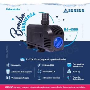 Especificações técnicas: Marca: Sunsun Modelo: HJ-4500 Potência: 80W Hmax: 3.8m altura máxima que a bomba consegue elevar a água Vazão: 5000 L/h Voltagem: escolha a voltagem no botão do anúncio Indicado para aquários e lagos de até 1000L Medidas: 9 x 17 x 20cm larg x alt x profundidade Peso: 2,310kg Tamanho do fio: 240cm