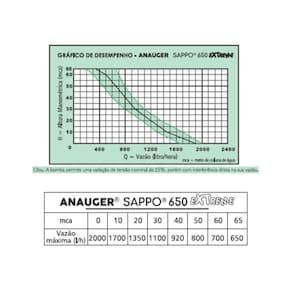 - Marca: Anauger; - Referência: 60560; - Vazão máxima: 2.000 litros/hora; - Elevação máxima: 65 M.C.A; - Temperatura máxima da água: 35C; - Dimensões: Altura de 290 mm e diâmetro de 155 mm - saída de 3/4 polegadas; - Tensões: 220V; - Altura manométrica máxima: 65m (elevação); - Bombeamento de água sem resíduos sólidos; - Frequência: 50 e 60 HZ; - Isolação Elétrica: Classe H; - Grau de proteção: IP68; - Proteção contra choque elétrico: Classe II; - Certificação: ABNT NBR ISO 9001; - Garantia: Até 2 anos de garantia.