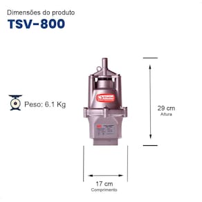 Residencial: Abastecimento de Reservatórios/caixas d'água, cisternas, pressurização de jardins. Acompanha bóia elétrica: Não Acompanha válvula de retenção: Não Altura: 17 cm Altura manométrica total: 70 mca Ambiente Principal: Jardim e Varanda Composição: Acompanha 3 metros de cabo e Kit de Instalação (3 abraçadeiras e curva suporte). Diâmetro de 165mm. Carcaça em alumínio. Parafusos de fixação em aço inox (não enferrujam). Comprimento: 29 cm Conexão de entrada/saída: Bocal de Recalque para mangueira de 1" Ergonômico: Não Funcionamento: Elétrica Itens Inclusos: Bomba Submersa Vibratória Tsv-800 220v Largura: 17 cm Manual de Montagem e Instalação: https://product-hub-prd.madeiramadeira.com.br/958317/documents/de994000-7bd8-4bef-8f3a-f1ac9534da9424173355783172789206519.pdf Material Principal: Alumínio Modelo: BOMBA SUBMERSA VIBRATÓRIA TSV-800 1/2 cv MONOFÁSICO MOTOR THEBE IP68 220V Necessita Montagem: Não Origem do Produto: Nacional Peso: 6,1 kg Potência do motor: 0,5 HP Profundidade de sucção: 70 m Recomendações de Uso, Manutenção e Limpeza: Verifique nosso Manual de Manutenção Temperatura Máxima da Água: 35 °C Tipo de bomba de água: Submersível Vazão máxima: 1.700 L/h Voltagem: 220V