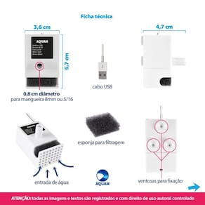 Características: Bombinha submersa silenciosa e compacta Alimentação DC 5V para tomada USB Baixo consumo de energia Possui ventosas para fixação Fácil instalação, limpeza e manutenção Resistente Durável Não aconpanha fonte de alimentação tomadinha