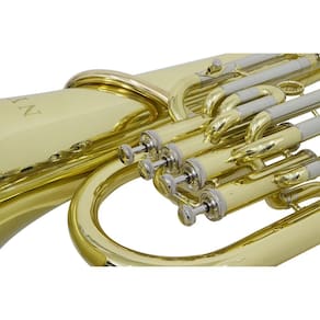 Bombardino Euphonium de 4 Chaves EP 340 Laqueado Dourado com Case New York O Bombardino de 4 Pistos Euphonium New York é uma excelente opção para quem busca por um som potente em um instrumento de qualidade, com afinação em bb, possui detalhes cromados e pisto em Cupronickel, uma liga metálica de cobre e níquel, com até 30% de níquel que oferece uma boa resistência a corrosão e a fadiga.