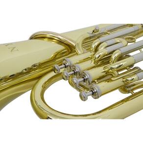 Bombardino Euphonium de 4 Chaves EP 340 Laqueado Dourado com Case New York O Bombardino de 4 Pistos Euphonium New York é uma excelente opção para quem busca por um som potente em um instrumento de qualidade, com afinação em bb, possui detalhes cromados e pisto em Cupronickel, uma liga metálica de cobre e níquel, com até 30% de níquel que oferece uma boa resistência a corrosão e a fadiga.