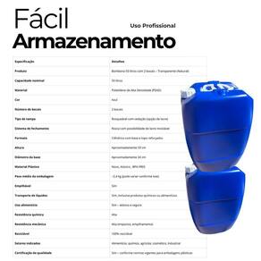 Bombona azul 50l com tampa rosca e lacre para alimentos e químicos com 02 bocais e 02 alças Atenção: Comercializamos apenas as bombonas de 50 litros novas e vazias Os títulos servem apenas para demonstrar suas usabilidades - nesta compra você vai receber - 01 x bombona de 50 litros azul com 02 tampas e alças plásticas A bombona 50l com tampa rosca disponível na nastripack, é a solução perfeita para o armazenamento e transporte seguro de líquidos e sólidos em diversos segmentos. Produzida em polietileno de alta densidade pead , esta embalagem oferece alta resistência mecânica, longa vida útil e segurança total para uso industrial, comercial ou doméstico. Ideal para empresas que prezam pela segurança de seus produtos e também para consumidores finais que precisam de uma embalagem robusta e confiável. Principais benefícios da bombona 50l tampa rosca nastripack: - alta resistência e durabilidade: fabricada com pead 100% virgem, resistente a impactos, quedas e agentes químicos. - versatilidade de uso: ideal para indústrias alimentícias, químicas, farmacêuticas, cosméticas, cervejeiras e mais. - vedação segura: tampa rosca com lacre inviolável que evita vazamentos e contaminações. - empilhável: design otimizado para facilitar o armazenamento e transporte. - atóxica: apropriada para contato com alimentos e bebidas, conforme normas da anvisa. Especificações técnicas da bombona 50l nastripack - capacidade nominal: 50 litros - capacidade útil: 57 litros Material: polietileno de alta densidade pead - altura total: 550 mm - largura maior lado : 385 mm - largura menor lado : 317 mm - diâmetro interno da boca principal: 2 polegadas - diâmetro do bocal secundário: 3/4 polegadas Peso aproximado: 1,9 a 2,1 kg Espessura mínima das paredes: 1,8 mm Cores disponíveis: azul, branco e natural translúcido Consulte outras cores . Alças integradas: facilita o manuseio Altura para rotulagem: 205 mm Aplicações recomendadas: - armazenamento de produtos alimentícios óleos, condimentos, grãos - transporte de insumos químicos e líquidos industriais - fermentação de bebidas artesanais cerveja, kombucha - estocagem de água potável ou não potável - uso em fazendas, indústrias, comércios e residências - melhor custo /pack - venda unitária ou em grandes quantidades - atendimento personalizado Resumo: Bombona de 50 litros tampa fixa com 2 bocais e 2 alças nastripack Matéria prima virgem Cores: translucida natural / azul e branco leitoso Formato: retangular Altura: 550 mm Largura 01 385 mm / 02 317 mm Diamentro interno bocal maior: 50 mm Diamentro interno bocal menor: 33 mm Espessura minima da parede: 1,8mm Altura maximo para rotulos: 205 mm Peso minimo: 1900 gr Padrao: 2000 gr Maximo: 2100 gr Capacidade nominal 50 litros Capacidade real: 57 litros Head space 5 % Consideraçoes técnicas bombona 50l nastripack: O plástico de pead e pp utilizados são aprovados para utilização na indústria alimentícia e farmacêutica, possuindo certificado de aprovação do instituto adolfo lutz e registro no dinal Apresentam uma faixa de temperatura de trabalho entre - 25º c e + 90º c O que permite uma boa performance da embalagem tanto no armazenamento em freezer, quanto no envase a quente As matérias primas utilizadas na fabricação das embalagens são adquiridas diretamente da indústria petroquímica O que nos dá de reprodutibilidade do processo e qualidade final Considerações finais da bombona 50 litros nastripack Dimensões projetadas para otimização de sistemas de paletização área, estabilidade, empilhamento Bocal projetado para facilitar sua total adaptação aos vários sistemas de enchimento e permitindo total esvaziamento da embalagem, evitando a sobra de resíduos do produto embalado em seu interior. Adquira já Bombona,bombona nastripack.