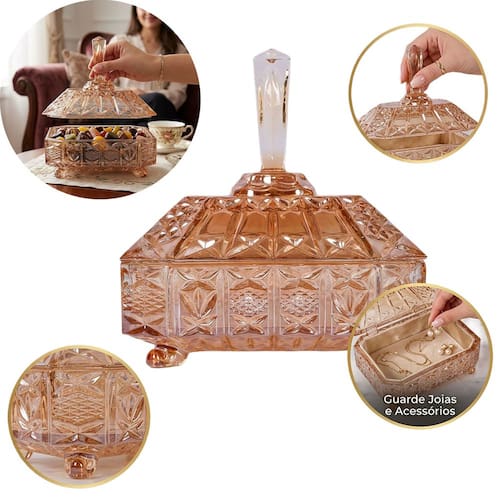 VERSATILIDADE DE USO: Ideal para armazenar bombons, guloseimas, cápsulas de café ou pequenos objetos com total higiene. Bomboniere Potiche Cristal Dourado 20cm Luxo Com Tampa