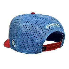 Boné Trucker Tecido: Poliester Frente: Bordado Baixo Relevo Lateral: Contorno Bordado / Bordado Alto Relevo Aba curva moldável Fecho SNAPBACK por pinos de pressão ajustável na parte traseira. Profundidade: entre 14 a 16cm, medindo do pino no topo do boné e seguindo pela costura até a sua base.