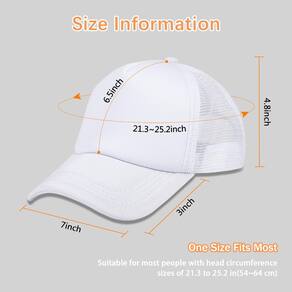 -?Tamanho único para a maioria?Essas tampas snapback vêm com uma fivela de plástico ajustável, acomodando a maioria dos tamanhos de cabeça com uma circunferência de aproximadamente 54-64 cm (21,5-25,2 polegadas). Adequados para mulheres e homens, esses bonés são uma excelente opção para chapéus de caminhoneiro em branco, cabendo em uma ampla variedade de formatos de cabeça