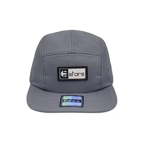 Boné E-Stras 5Panel, Aba Reta floral negra. Patch com estampa personalizada na parte frontal, inteiro de tecido, fechamento ajustável e costura reforçada. Aba e forro internos personalizados. Tendência da moda.