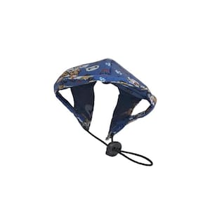 Esse boné está disponível no tamanho G e na cor azul. Para escolher o tamanho ideal para o seu pet, basta medir a circunferência da cabeça, a distância de orelha a orelha e da aba até a nuca.