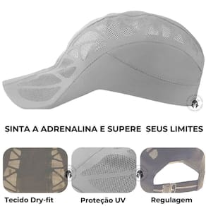 Características: Acabamento impecável Tecido: Em Malha Poliéster Dry fit Tamanho: Ajustável Cores Disponíveis: Cinza Circunferência da cabeça: 55 a 60cm Aba: 7cm