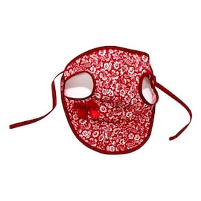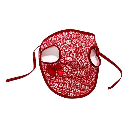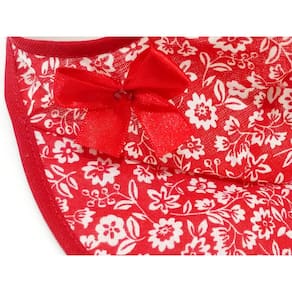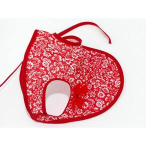 Acabamento viés na cor vermelha, com lacinho de cetim na cor veremelha;